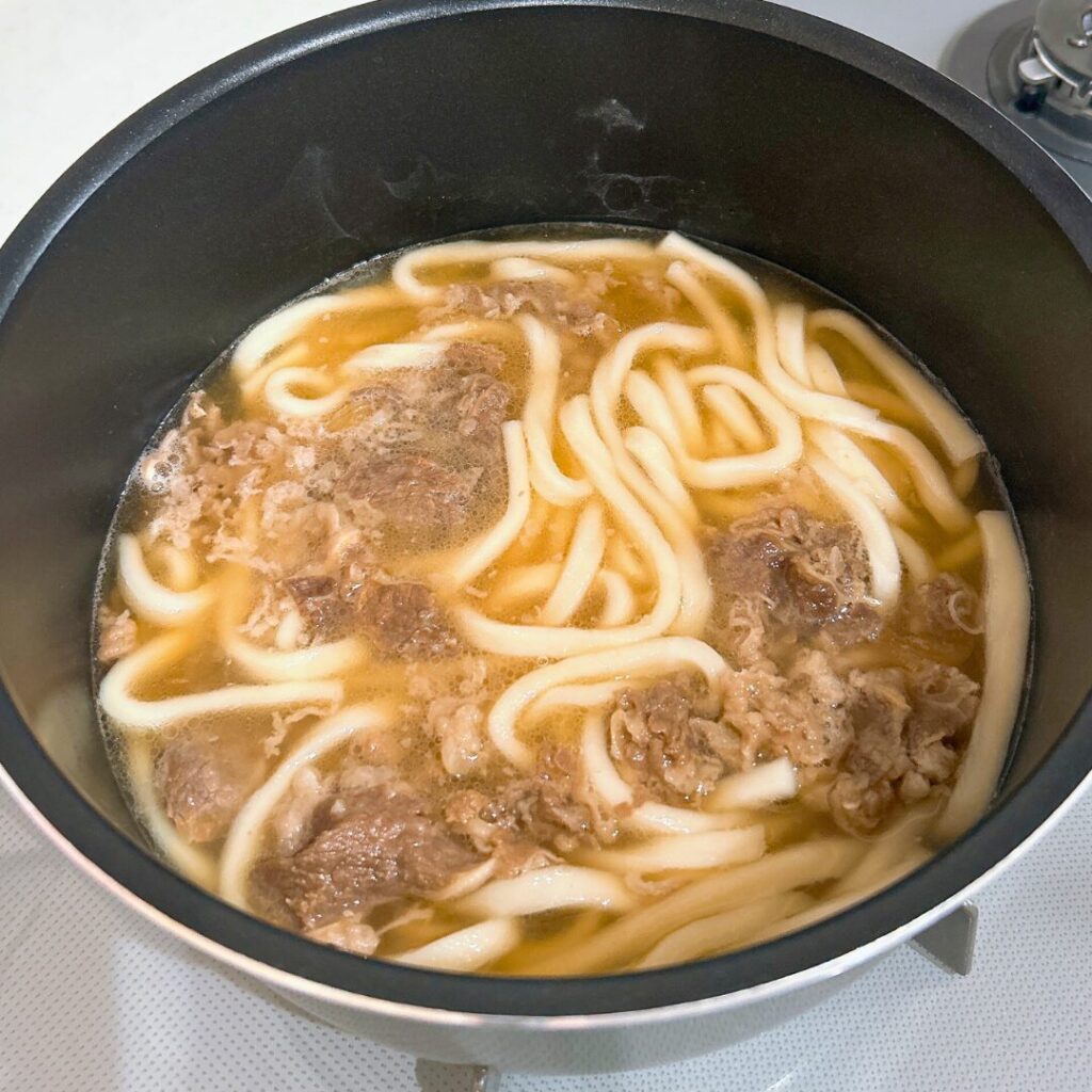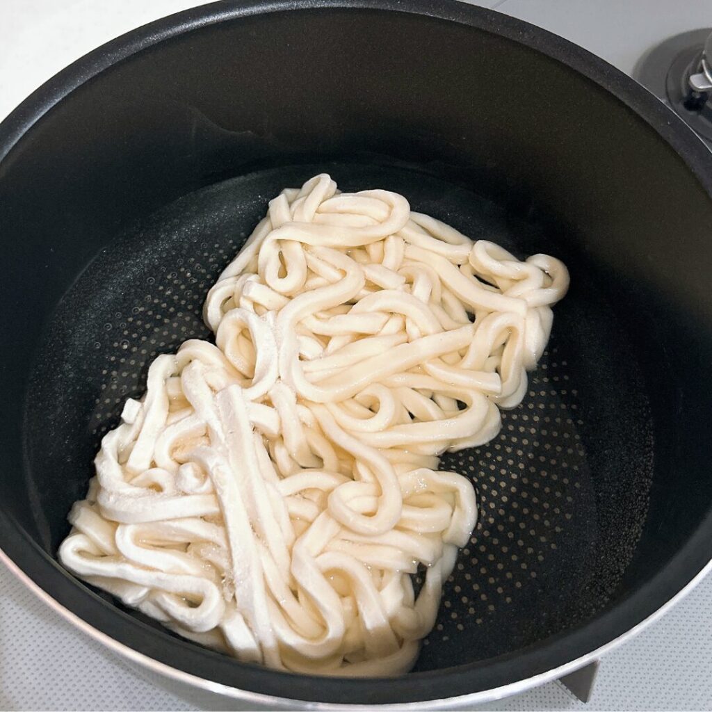 まずは凍ったままのうどん麺を沸騰したお湯でゆでていきます。