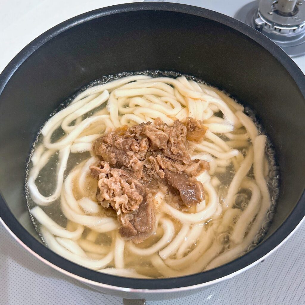 麺がほぐれてきたタイミングで、お湯で解凍しておいた甘辛お肉を投入!